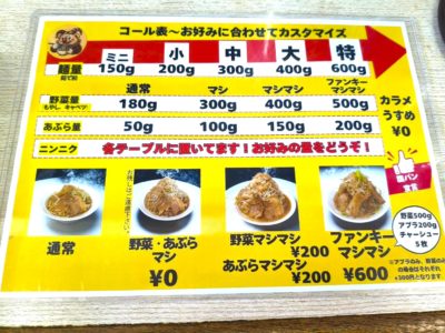 野菜、あぶら「マシ」まで同一料金。普通にしましたが、がっつり食べたい方はマシで。