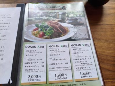 サラダ、スープ、パン、選べるパスタ、選べるスイーツ、選べるドリンクがついて2000円。