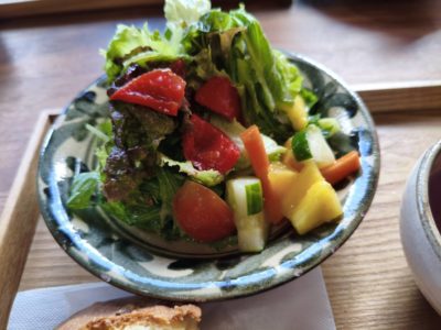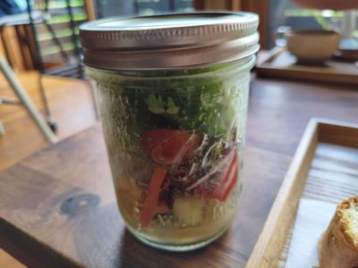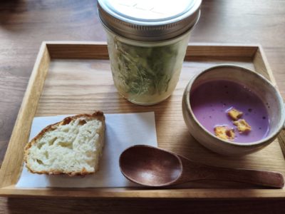 玉ねぎのフォカッチャ、むらさきいものスープ、メイソンジャーのサラダ