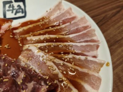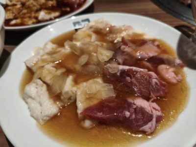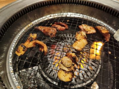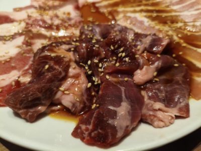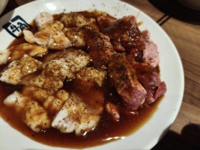牛豚盛り合わせ。写真は2人前400g ホルモン白200グラム、ホルモン黒200グラム、さらには枝豆食べ放題!かなりボリューミー!!豚ハラミみたいな部位も交じってる!早速焼いていきます!!美味しそう!! 旨い!!ハイボールが止まらん!!