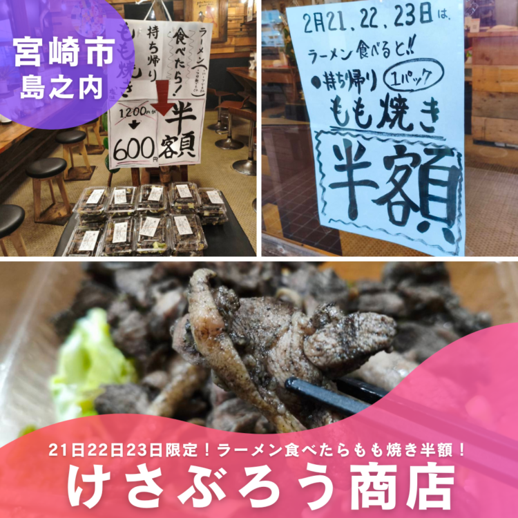 宮崎市島之内【けさぶろう商店 住吉店】21日22日23日限定!らーめん1杯につきもも焼き半額!! ひじり~ 13時間前 21日22日23日もも焼き半額!!住吉のけさぶろう商店今日明日明後日限定!ラーメンを食べた方!1杯につき1個もも焼き持ち帰り半額!定食やらメニューも豊富でファミリーも多い!! 大人一人ラーメン1杯につき子供1人こどもラーメン無料の一蘭風システムがあるのはすごい!!お子様と一緒におすすめかも!? らーめん食べたら半額!! 旨い!!明後日までにもう一度行きたい。23日までです!!お急ぎください! 地鶏もも子とけさぶろう商店 住吉店 宮崎県宮崎市島之内7073−2 0985-37-3200 この記事が気に入ったらいいね!しよう最新情報をお届けします