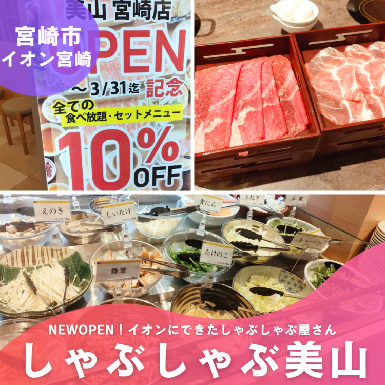 NEWOPEN!イオン宮崎【しゃぶしゃぶ美山】宮崎初上陸のしゃぶしゃぶ食べ放題のお店! ひじり~ 1年前 イオン宮崎にしゃぶしゃぶ食べ放題のお店が昨日オープン!! 常人の3倍食べるI君たちと訪問。3月末まで10%OFF!ひとり1鍋制とのこと。しゃぶしゃぶ食べ放題コースにはビュッフェもついてます。 牛豚食べ放題コースが最もリーズナブルで3058円。ちょっとリッチな値段設定。 食べ放題以外にもセットメニューもありました。 オープン記念でいまだけ10%OFF!3058円の牛豚コースを注文。お野菜 たくさんのたれと調味料 カレーとご飯とちらし寿司デザート食べ放題は別途605円(全員注文が必要だったので私が甘いもの食べないので今回は断念。) チョコレートフォンドュや ハーゲンダッツも食べ放題でした!!ソフトドリンク飲み放題は264円アルコール飲み放題は1738円で1人だけ注文可能。ビール旨い。牛豚コースはこのお肉2種類が食べ放題!!すき焼きと和風だし 最高ですよ。こんなん無限に食べられる。 お野菜もたっぷりで満腹ごはんでした(*´ω`*) イオンにまた新しいお店がオープンしてお店選びも楽しくなりますね(*^^*) ごちそうさまでした!! しゃぶしゃぶ美山 この記事が気に入ったらいいね!しよう最新情報をお届けします