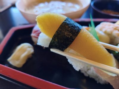 数の子、かんぱち、マグロ、ネギトロ、エビ、イカ、鉄火、レタス巻ネタがでっかいので半分にカットしてあるのもうれしい。うまい。