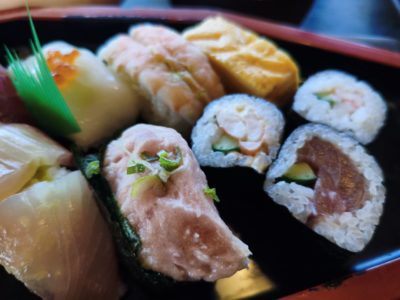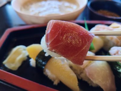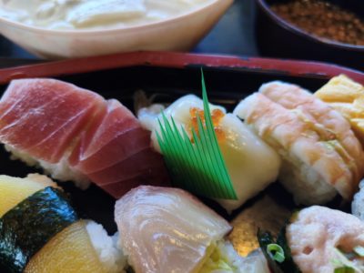 数の子、かんぱち、マグロ、ネギトロ、エビ、イカ、鉄火、レタス巻ネタがでっかいので半分にカットしてあるのもうれしい。うまい。
